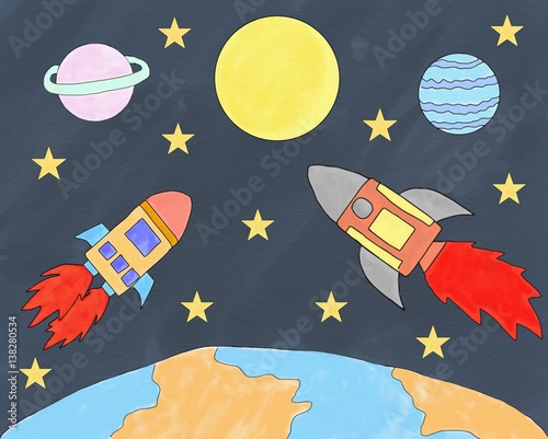 Abstract Hand Draw Doodle Rocket In Space World With Star On Paper